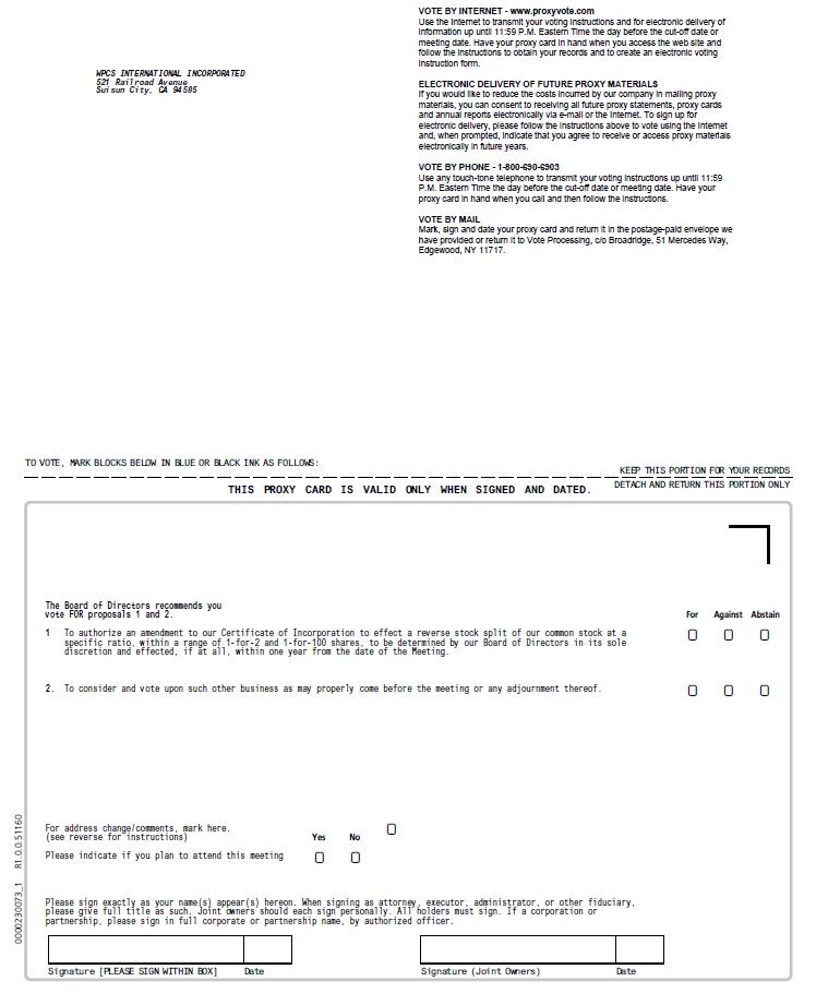 Any written notice of revocation or subsequent proxy should be sent to WPCS International Incorporated, Attention: Secretary, 521 Railroad Avenue, Suisun City, California 94585, or hand delivered in person before the voting at the Meeting.