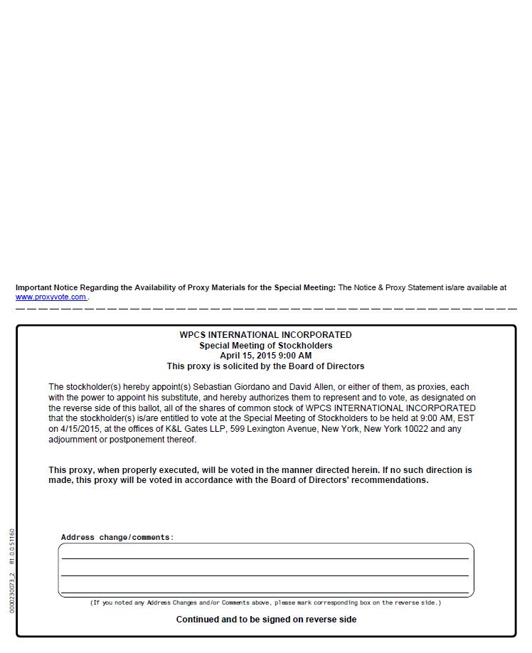 A special meeting (the “Meeting”) of the stockholders of WPCS International Incorporated (the “Company”) will be held on April 15, 2015, 9:00 a.m. local time, at the offices of K&L Gates LLP, 599 Lexington Avenue, New York, New York 10022, for the following purposes: