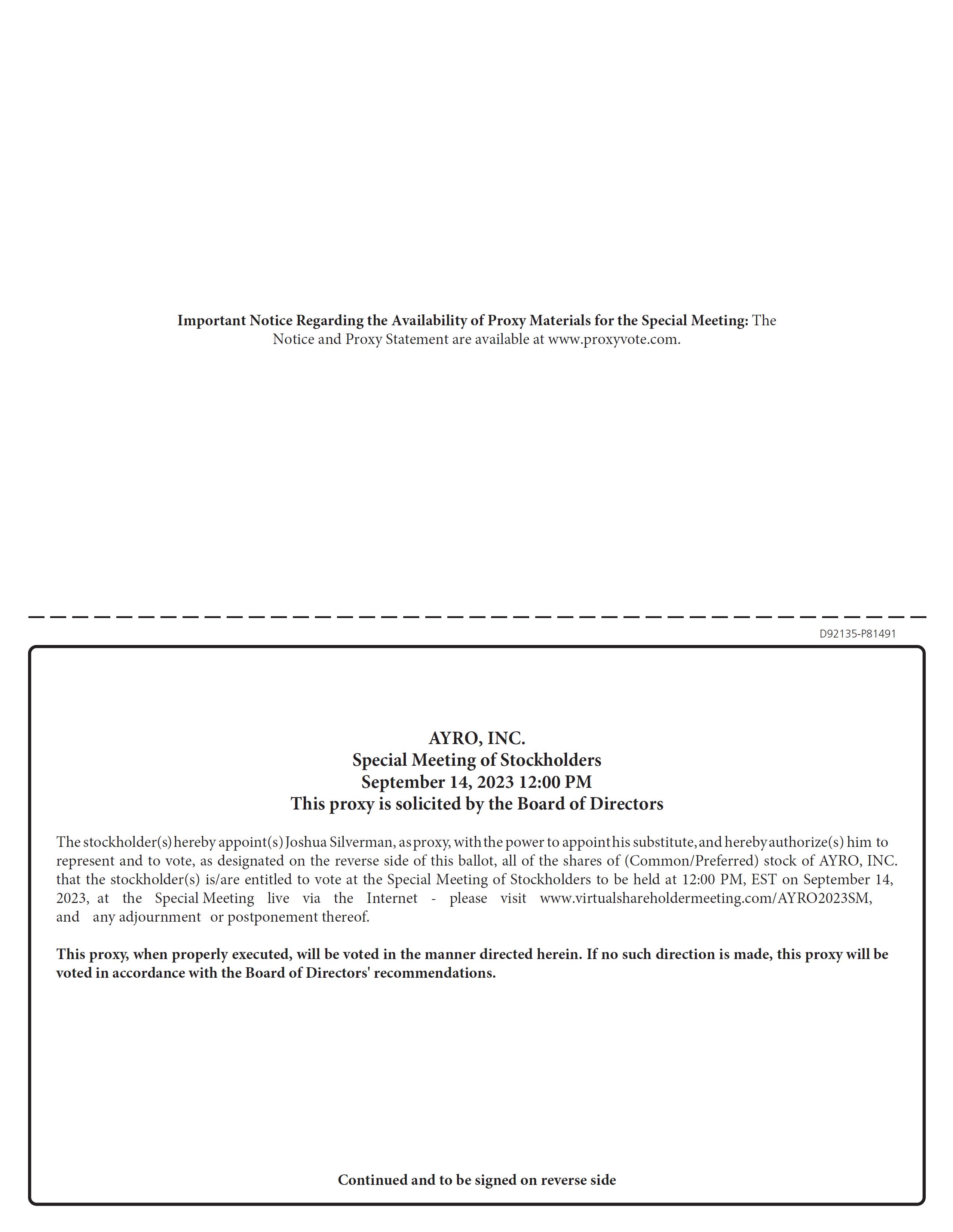 To be admitted to the virtual special meeting, you will need to log-in at www.virtualshareholdermeeting.com/AYRO2023SM using the 16-digit control number found on the proxy card or voting instruction card previously mailed or made available to stockholders entitled to vote at the special meeting.