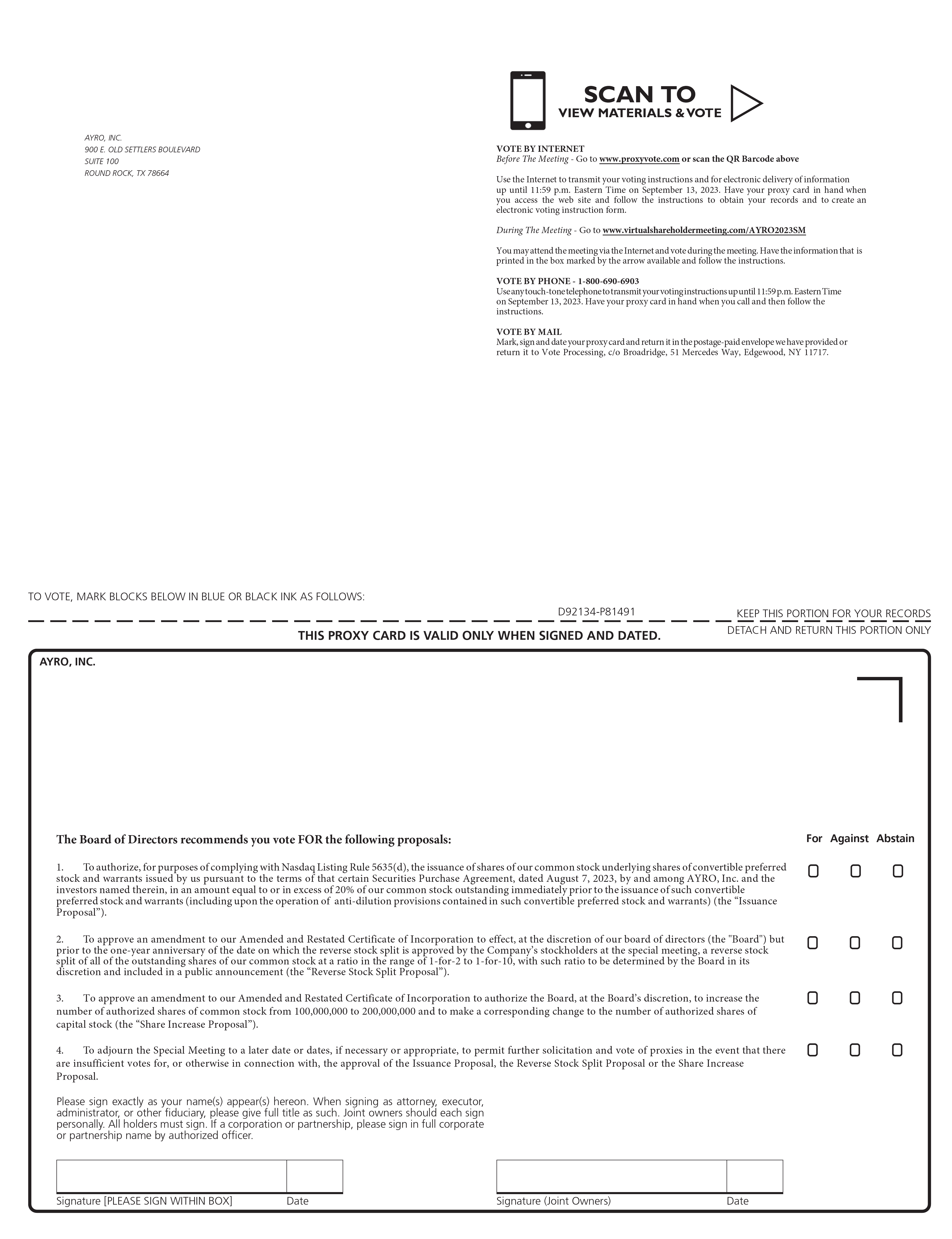 | 1. | A proposal to authorize, for purposes of complying with Nasdaq Listing Rule 5635(d), the issuance of shares of our common stock, par value $0.0001 per share (“Common Stock”) underlying shares of convertible preferred stock and warrants issued by us pursuant to the terms of that certain Securities Purchase Agreement, dated August 7, 2023, by and among AYRO, Inc. (the “Company”) and the investors named therein, and an engagement agreement between the Company and Palladium Capital Group, LLC, in an amount equal to or in excess of 20% of our Common Stock outstanding before the issuance of such convertible preferred stock and warrants (including any amortization payments made to the holders of such convertible preferred stock in the form of issuance of shares of Common Stock and upon the operation of anti-dilution provisions contained in such convertible preferred stock and warrants) (the “Issuance Proposal”); |
